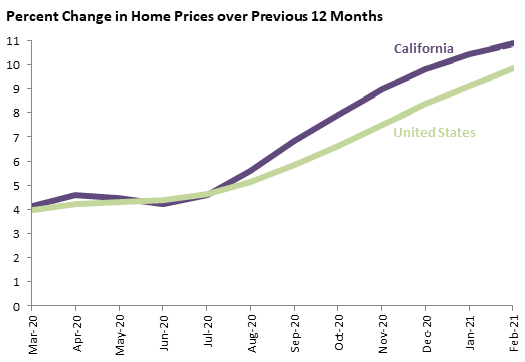 February 2021 data show continued rapid home price growth in both California and the rest of the country over the past year: the typical home in California has appreciated 10.9 percent since February 2020, somewhat above the national figure of 9.9 percent. These are the highest 12-month growth rates in the state since 2014 and in the nation since 2006, although the gap between the state and national growth rates is the smallest since September. Low interest rates that make monthly mortgage payments more affordable (all else equal) have contributed to the price increases, and the pandemic-driven shift to remote work may also be driving home prices up.