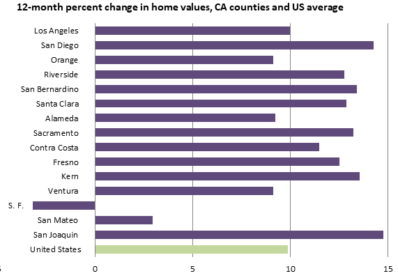 The graph below shows appreciation over the past 12 months for the state’s 15 largest counties, and suggests that the shift to remote work has been a key factor in recent price changes. San Francisco has long been northern California’s largest business hub, and historically a large share of its work force has commuted in from other counties. With remote work becoming more common, there is less of a premium on living close to the office and as such home prices in San Francisco have declined while prices in most counties from which large numbers of people commute into San Francisco have risen significantly. San Francisco’s average home price is down 3.2 percent over the past year, neighboring San Mateo is up just 3.0 percent, and every other large county in the state is up at least 9 percent.