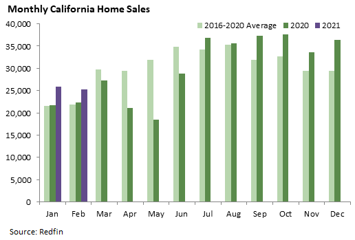 Home sales can be a good indicator of the health of the state’s economy and housing markets. California home sales have surged since the pandemic-driven plunge last spring. February marked the sixth straight month that sales were at least 15 percent above the recent average for the month, and the total of 25,212 sales was the highest February figure since at least 2011. It appears historically low mortgage rates and possibly the increased emphasis on working from home have caused a boom in home sales despite the continued weakness in overall economic activity. The graph below shows unadjusted home sale counts according to Redfin, a national real estate brokerage. Sales are booked when they close, so monthly counts primarily reflect contracts that were signed in the previous month.