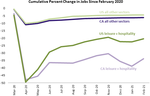 The figure below shows how employment has evolved in both the state and the nation since the start of the pandemic. Overall employment in the state as of the middle of February was 9.4 percent below the level of February 2020, considerably worse than the national figure of 6.2 percent. Nearly half of this 3.2 percentage point gap is attributable to the leisure and hospitality sector which includes restaurants, bars, and hotels. California leisure/hospitality employment rebounded strongly in February after two disastrous months in December and January, although it remains further below the November level than its national counterpart does. Aggregate employment in other sectors has recovered at the same slow pace in both the state and the rest of the nation for more than half a year now.