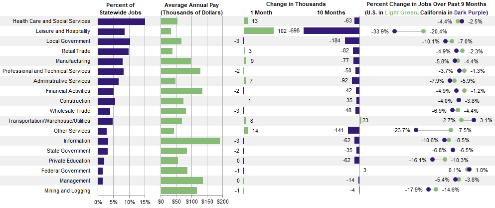 California's Employment Development Department and the U.S. Bureau of Labor Statistics released California's February 2021 state jobs report last Friday. Statewide nonfarm employment grew by an estimated 141,000 in February, the biggest gain since June. The official unemployment rate fell from 9.0 percent in January to 8.5 percent in February, the lowest rate since last March. The unemployment rate stood at 3.9 percent in February 2020 before the COVID-19 pandemic caused large-scale upheavals. The survey reflects job changes through the week of February 7 to February 13. California accounted for 37.4 percent of the national estimate of 377,200 net jobs gained in February, more than triple its 11.5 percent of the nation’s total payroll jobs as of February 2020.