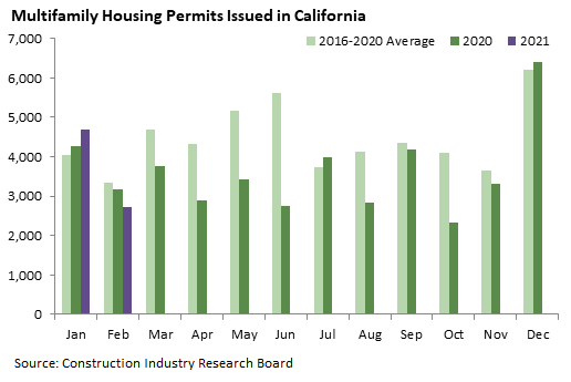 California recorded 7,827 housing permits in February, down 7 percent from February 2020. Total permits in 2021 year to date are about 3 percent behind the same months in 2020, before the pandemic hit.