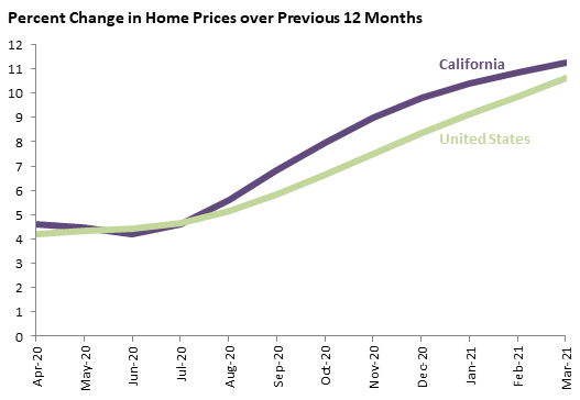 March 2021 data show continued rapid home price growth in both California and the rest of the country over the past year: the typical home in California has appreciated 11.2 percent since March 2020, somewhat above the national figure of 10.6 percent. These are the highest 12-month growth rates in the state since 2014 and in the nation since 2006, although the gap between the state and national growth rates is the narrowest since August. Low interest rates that make monthly mortgage payments more affordable (all else equal) and low inventory levels have contributed to the price increases, and the pandemic-driven shift to remote work may also be driving home prices up.