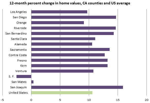 The graph below shows appreciation over the past 12 months for the state’s 15 largest counties, and suggests that the shift to remote work has been a key factor in recent price changes. San Francisco has long been northern California’s largest business hub, and historically a large share of its work force has commuted in from other counties. With remote work becoming more common, there is less of a premium on living close to the office and as such home prices in San Francisco have declined while prices in most counties from which large numbers of people commute into San Francisco have risen significantly. San Francisco’s average home price is down 2.6 percent over the past year, neighboring San Mateo is up just 0.4 percent, and every other large county in the state is up at least 9 percent. San Francisco and San Mateo still have higher home prices than any of the state’s other 56 counties.