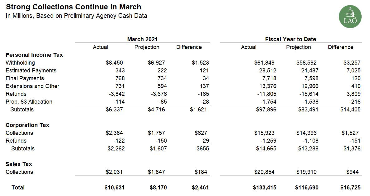 The recent trend of strong collections from the state’s three largest taxes—the personal income tax, corporation tax, and sales tax—continued in March, with revenues exceeding projections by $2.5 billion (30 percent). While collections were up across the board, income tax withholding and corporation tax payments accounted for most the higher-than-expected collections in March. March corporation tax payments were a mix of estimated payments for 2021 and pass-through entity final payments for 2020.
