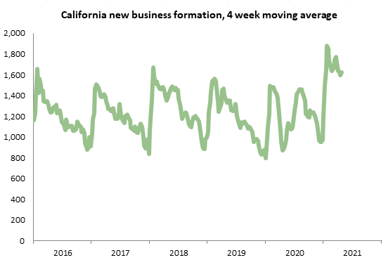 This graph shows U.S. Census data for the four-week average of new business creation since 2016, considering only those businesses that report having planned wages as opposed to shell corporations or holding companies. The standard pattern within a year is for a surge of new business formation at the beginning, then gradual declines as the year goes on. This pattern was upended in 2020: the pandemic caused a big drop in the spring, followed by a surge as the economy began to recover. So far 2021 has seen the normal pattern with a peak in January, although with significantly more firms than usual being created in each week of the year.