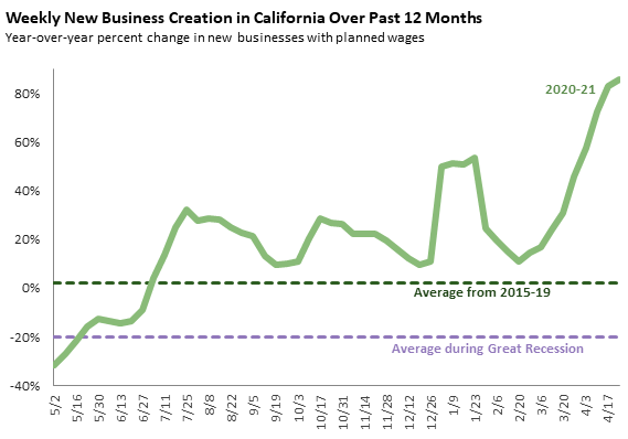 The next graph below shows the four-week average growth rate in 2020-21 relative to the same week in 2019-20. Growth in new business creation has been heightened since last July. Nearly twice as many new businesses were created this April as compared to a year ago when the economy was in the depths of the early pandemic slowdown.