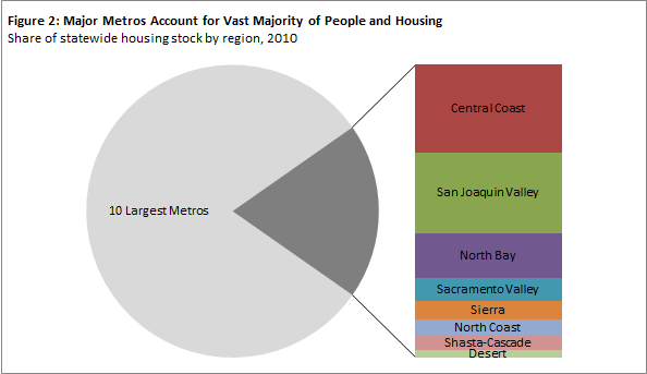 About One-Fifth of California’s Housing is Located Outside Major Metros. Most of California’s nearly 14 million housing units (about 80 percent) are located in the state’s major metros, while the remainder (about 20 percent) are located in the eight regions outside the state’s major metros. The largest of these regions are the Central Coast (about 800,000 housing units) and San Joaquin Valley (about 750,000 housing units), which together account for more than half of all housing outside of the state’s major metros.