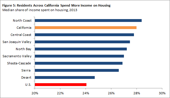 Higher Home Prices and Rents Mean Californians Spend a Large Share of Their Income on Housing. As a result of the high home prices and rents found in most parts of California, households in every region of California spend more of their income on housing than the typical U.S. household. Households spend the greatest share of their monthly income on housing in the North Coast, Central Coast, and San Joaquin Valley regions. In these regions, a typical household spends around 28 percent of their income on housing costs each month, roughly equal to the share spent by the typical California household and 4 percentage points more than the typical U.S. household.