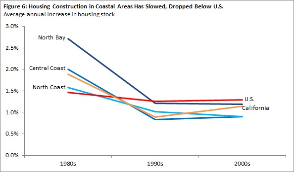 Less Housing Construction Generally Leads to Higher Prices. In California’s High Housing Costs, we show that declining rates of new housing construction tend be associated with higher home prices and rents. This is because reduced housing construction can lead to a shortage of housing. With housing in limited supply, households compete with each other and bid up prices and rents. Looking over the last three decades, regional trends in California appear to be consistent with this story. Building levels in relatively expensive coastal regions—Central Coast, North Bay, and North Coast—dropped below the national average during the 1990s and 2000s. In contrast, building levels generally exceeded the national average in relatively inexpensive inland regions.