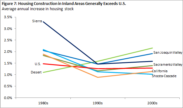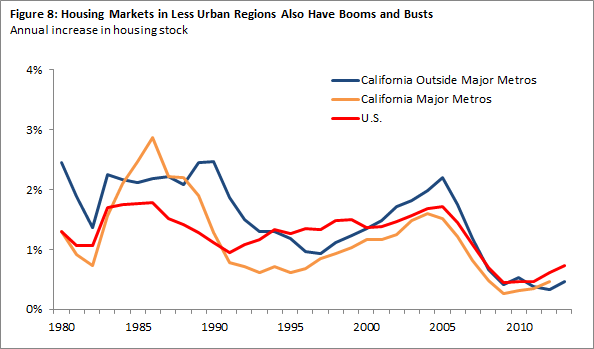Housing Construction Is Cyclical. Housing construction tends to rise and fall over time tracking with changes in many factors such as the health of the economy and mortgage lending availability. During the U.S. housing bubble of the mid-2000s, building levels rose substantially in most parts of the country. Housing construction reached exceptionally high levels in areas of California outside the state’s major metros. At their peak in 2005, annual building rates (percentage increase in an areas housing stock) averaged 2 percent in regions outside of California’s major metros, compared to 1.7 percent in the rest of the country. At the peak, build rates in these areas were nearly double the average building rates experienced during the 1990s.
