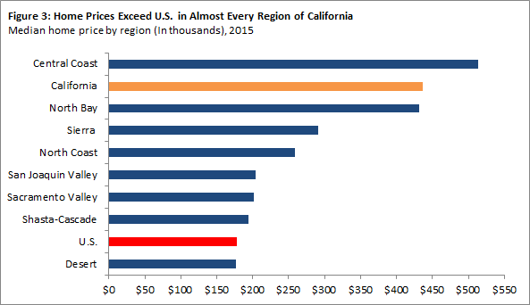 Home Prices Just About Everywhere in California Exceed the Nation. Median home prices in the eight regions outside of California’s major metros vary considerably, from a high of $513,000 in the Central Coast to a low of $177,000 in the Desert. Home prices in all but one region (the Desert) exceed the U.S. median home price ($179,000). The Central Coast, however, is the only region outside the state’s major metros where home prices are higher than the statewide median ($437,000).