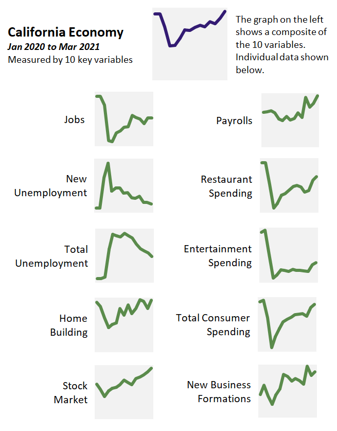 The COVID-19 pandemic reshaped the California economy. Over the last year, the state has experienced abrupt and dramatic swings in economic activity. While a variety of data is available to track developments in the state economy, drawing clear conclusions from these disparate data points can be difficult. To help make sense of this varied data, this post pulls together and synthesizes ten key data points on the state economy. Our goal is to provide a quick, simple snapshot of recent trends in this data. The graphic below provides this snapshot.