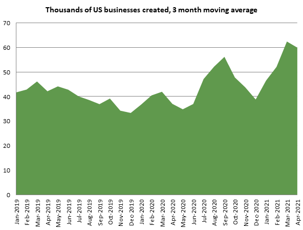 The figure below shows U.S. Census data for the three-month average of nationwide new business creation since 2019, considering only those businesses that report having planned wages as opposed to shell corporations or holding companies. It shows that business creation dropped in the early stage of the pandemic, then surged over the summer, then dropped in the fall as the pandemic worsened. It began to pick up again at the start of 2021. While the pandemic peaked in the U.S. in January, it may be the case that the second federal stimulus passed in December encouraged a new wave of business formations.