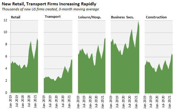 We have noted that Californians have been founding new businesses at an unusually rapid pace since July 2020, after most of the initial pandemic restrictions were largely lifted. This post examines new business creation by sectors of the economy. It uses national data, since sector data are unavailable at the state level.