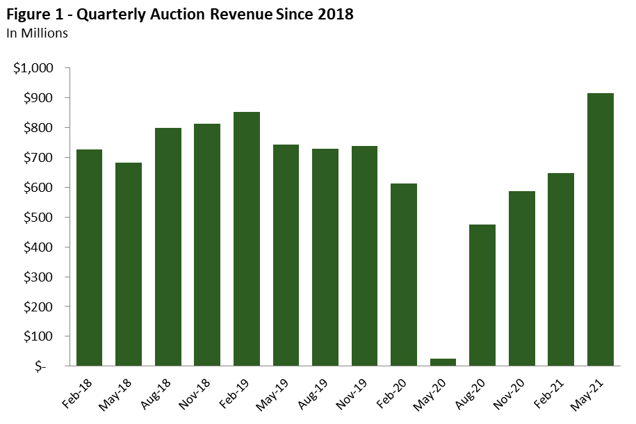 May 2021 Auction Generates $916 Million in State Revenue. The California Air Resources Board (CARB) released a summary of the results from the most recent quarterly cap-and-trade auction held on May 19, 2021. Based on the preliminary results, the state will receive an estimated $916 million in revenue from the auction. As shown in Figure 1, this amount is substantially more than what the state received from the February 2021 auction ($647 million). The change is due primarily to a 34 percent increase in the number of state-owned allowances offered and sold at the May auction compared to February. The cap-and-trade regulation requires that unsold allowances from previous auctions get reoffered at subsequent auctions, under certain conditions specified in the regulation. Since these conditions were met, the May auction offered about 12 million state-owned allowances that previously went unsold in the May 2020 auction.
