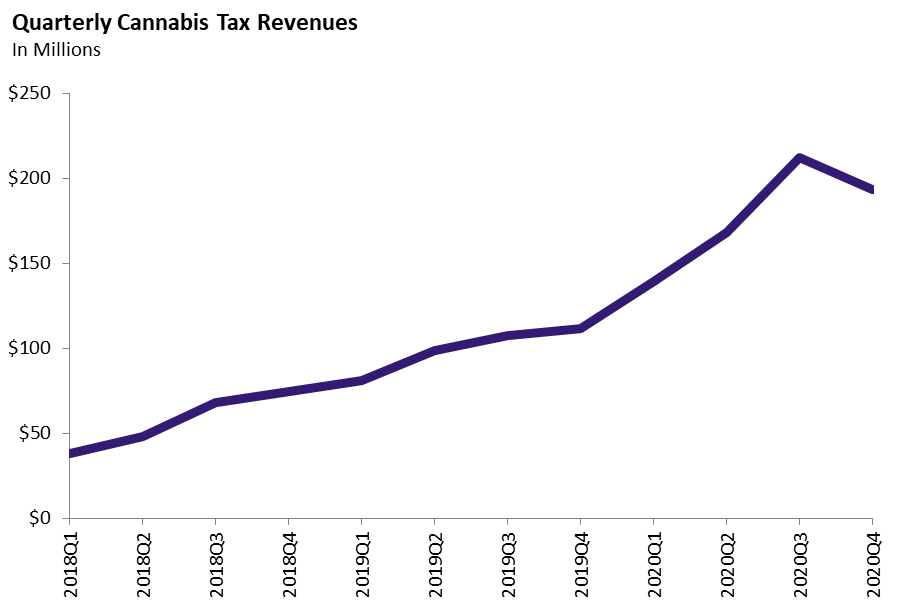 Third Quarter of 2020-21: $163 Million. The administration currently estimates that retail excise tax revenue was $132 million and cultivation tax revenue was $31 million in the third quarter of fiscal year 2020-21 (January through March).