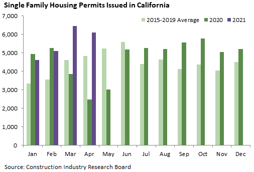 California recorded 10,903 housing permits in April, up 103 percent from April 2020, the trough of the pandemic recession. Total permits in 2021 year to date are 34 percent above the same months in 2020.