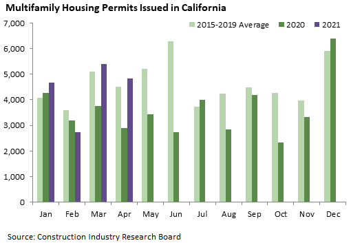 April’s total of 6,083 single family permits was slightly down from March, but the biggest April total since 2007. This is also the first time since 2007 that the state has had two straight months over 6,000 units. Single family activity has rebounded strongly since last spring’s pandemic-driven slump, as prices have risen sharply in most of the state’s metropolitan areas. Permits have been at least 25 percent above the 2015-19 average every month this year. The Inland Empire, Sacramento, and Los Angeles areas had the most permits as usual, but the Oakland and Fresno areas also posted high totals.
