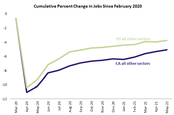 The next graph isolates aggregate employment in the other sectors and shows that California has gradually been closing the gap this year.