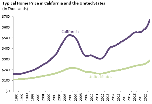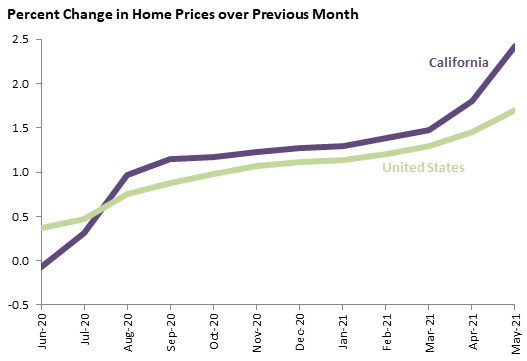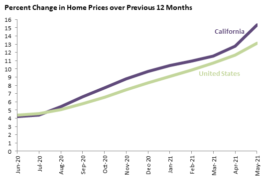 May 2021 data show rapidly accelerating home price growth in both California and the rest of the country over the past year: the typical home in California has appreciated 15.4 percent since May 2020, somewhat above the national figure of 13.2 percent. These are the highest 12-month growth rates in the state since 2014 and in the nation since at least 1996. High framing lumber prices, low interest rates that make monthly mortgage payments more affordable (all else equal), and low inventory levels have contributed to the price increases, and the pandemic-driven shift to remote work may also be driving home prices up.