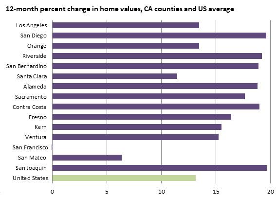 The graph below shows appreciation over the past 12 months for the state’s 15 largest counties, and suggests that the shift to remote work has been a key factor in recent price changes. San Francisco has long been northern California’s largest business hub, and historically a large share of its work force has commuted in from other counties. With remote work becoming more common, there is less of a premium on living close to the office and as such home prices in San Francisco have stagnated while prices in most counties from which large numbers of people commute into San Francisco have risen significantly. San Francisco’s average home price is roughly unchanged over the past year, and neighboring San Mateo is up just 6.4 percent. All the other large counties in the state are up at least 10 percent, and all but three of those are up at least 15 percent.