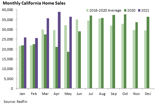 Home sales can be a good indicator of the health of the state’s economy and housing markets. While California home sales have surged since the pandemic-driven plunge last spring, May had fewer sales than April which is not the usual pattern for those two months. The May total of 36,359 sales was still the highest May figure in at least a decade. Historically low mortgage rates, strong income growth among the state’s higher earners, and possibly the increased emphasis on working from home have contributed to the recent boom, although it now appears that the sharp increases in prices in most of the state may be causing buyers to balk. The graph below shows unadjusted home sale counts according to Redfin, a national real estate brokerage. Sales are booked when they close, so monthly counts primarily reflect contracts that were signed in the previous month. As the figure shows, May is typically a fairly busy month.