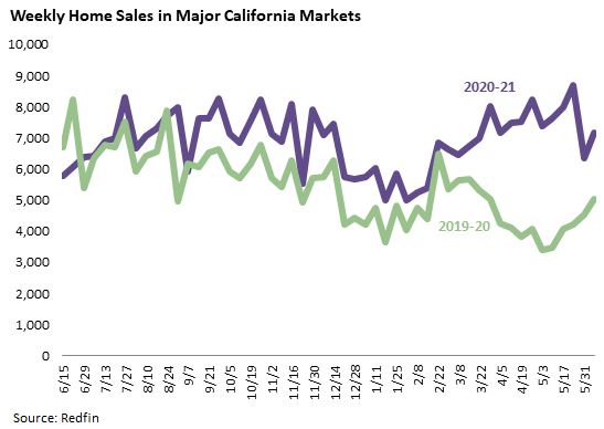 This next graph shows weekly counts for the past 52 weeks using Redfin data for California’s twelve largest markets. The deceleration of sales volume that started in May continued through early June.