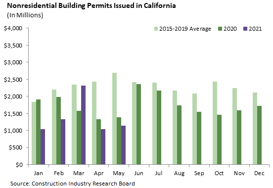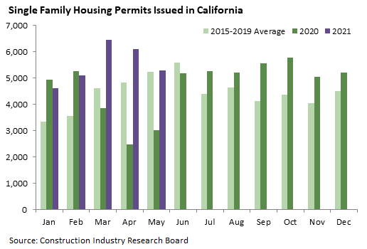 California recorded 9,291 housing permits in May, up 44 percent from May 2020 when much of the state was still locked down. Total permits in 2021 year to date are 33 percent above the same months in 2020.
