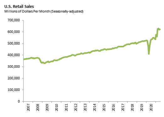 Retail Sales Remain Elevated. Seasonally adjusted U.S. retail sales grew 0.6 percent from May to June. Retail sales remain elevated due to dramatic growth in January and March. Cumulative six-month growth in sales from December 2020 to June 2021 was 16 percent.