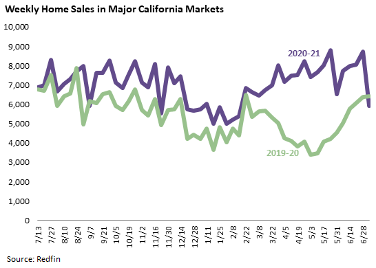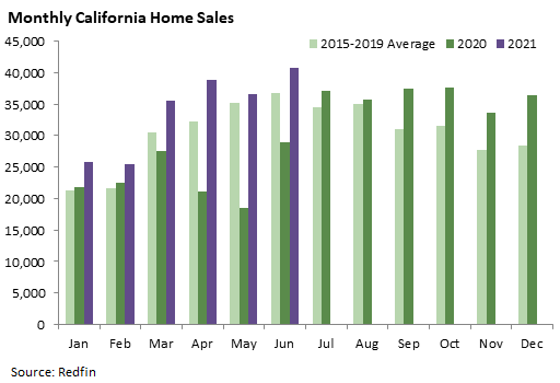 Home sales can be a good indicator of the health of the state’s economy and housing markets. California home sales have surged since the pandemic-driven plunge last spring, although the last two months have been only modestly above the recent average for those months. June is typically the most busy month of the year, and last month’s total of 40,755 sales was the highest monthly figure in at least a decade. Historically low mortgage rates, strong income growth among the state’s higher earners, and possibly the increased emphasis on working from home have contributed to the recent boom, although it now appears that the sharp increases in prices in most of the state may be tempering buyers’ enthusiasm to some extent. The graph below shows unadjusted home sale counts according to Redfin, a national real estate brokerage. Sales are booked when they close, so monthly counts primarily reflect contracts that were signed in the previous month.