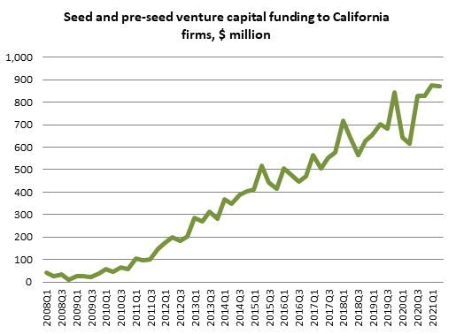 Most California firms that have gone public lately received significant funding from venture capital (VC) firms at several points before going public, starting at the ‘seed’ stage when a firm is just starting out and typically has no revenue yet. Data from Crunchbase, a private data service, show that seed and pre-seed stage funding has risen steadily over the past ten years.