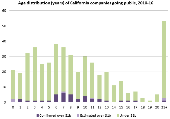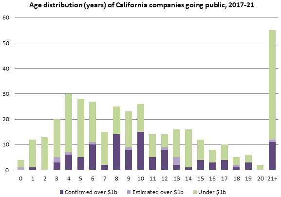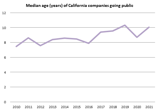 The first figure shows that the median age (as measured from its founding date to its IPO date) of California IPOs was typically around 8 years from 2010 to 2016, and has been in the 9-10 year range since then.