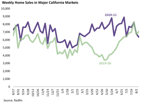 This next graph shows weekly counts for the past 52 weeks using Redfin data for California’s twelve largest markets. Sales over the last six weeks in the series (July 5-11 through August 9-15) were very similar to the same weeks in 2020. Sales typically peak in June and then gradually tail off over the rest of the year, as the above graph shows.