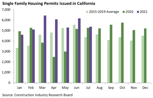 California recorded 9,676 housing permits in June, up 5 percent from July 2020. Total permits in 2021 year to date are 28 percent above the same months in 2020.