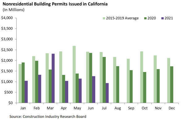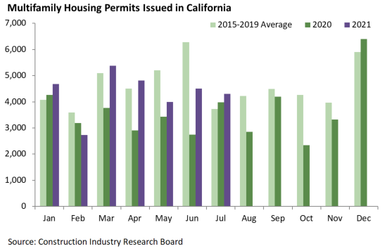 July’s total of 5,377 single family permits again exceeded the recent average for the month, although the last three months have been closer to the recent monthly average than the year’s first four months were. Single family activity has rebounded since last spring’s pandemic-driven slump, as prices have risen sharply in most of the state. The Inland Empire, Sacramento, and Los Angeles metro areas had the most permits in that order, which is the typical pattern.