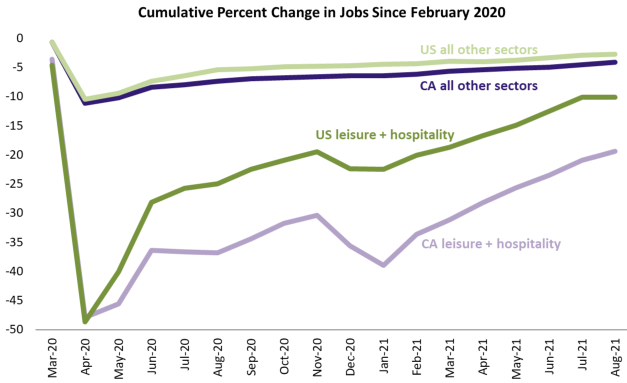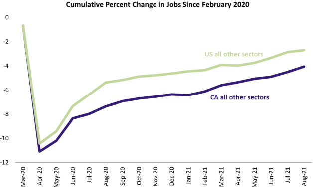 The figure below shows how employment has evolved in both the state and the nation since the start of the pandemic. Overall employment in the state as of the middle of June was 5.8 percent below the level of February 2020, considerably worse than the national figure of 3.5 percent. Nearly half of this 2.3 percentage point gap is attributable to the leisure and hospitality sector which includes restaurants, bars, and hotels. The leisure/hospitality gap closed somewhat in August: it may be the case that California restaurants and other businesses were generally running at lower capacity than the national average through the middle of July, and thus had less reason to curtail hiring as the pandemic surged.