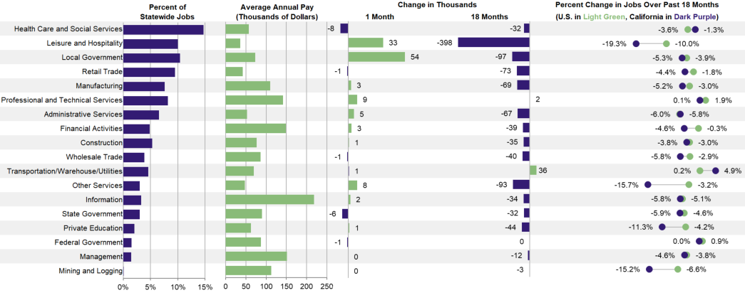 The next figure summarizes nonfarm employment by sector based on the monthly survey of employers. The leisure and hospitality sector discussed above accounted for about a third of the statewide net gain. More than half the gain came from the local government sector: August hiring was much higher than normal, as most California public schools are operating in person this academic year after being partially or fully remote last year.