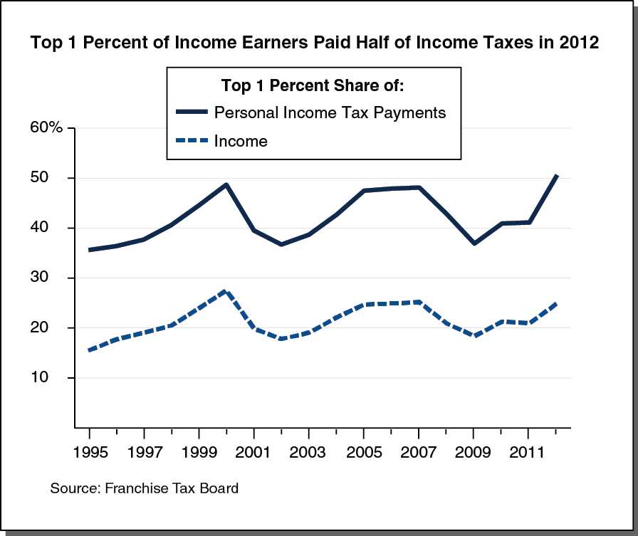 • Proposition 30’s Temporary Rate Increases. The share of income taxes paid by the top 1 percent increased in 2012 partly as a result of Proposition 30, which temporarily raises tax rates on single filers’ income above $250,000 a year and joint filers’ income above $500,000 a year. The top 1 percent of California resident income tax filers paid just over 50 percent of overall PIT revenues in 2012, which appears to be an all-time high. (For more information, see Exhibit A-10, Page 4 of 4, of the Franchise Tax Board’s May 2014 estimating exhibits, as well as other pages in that packet.)