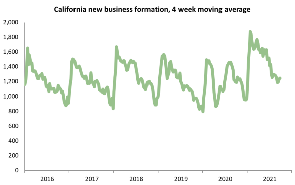 This graph shows U.S. Census data for the four-week average of new business creation since 2016, considering only those businesses that report having planned wages as opposed to shell corporations or holding companies. The standard pattern within a year is for a surge of new business formation at the beginning, then gradual declines as the year goes on. So far 2021 has seen the normal pattern with a peak in January, although with significantly more firms than usual being created in each week of the year.