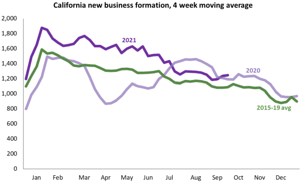 The next graph shows the four-week average growth rate in 2021 relative to both the 2020 figure and the 2015-19 average for the same weeks, and shows that 2021 has consistently outpaced the recent average. The pace of business formation over the summer was slower in 2021 than in 2020, as the reopening of the economy in the summer of 2020 saw a flurry of business creation in response to the disruption caused by the pandemic. The most recent weeks show 2021 running very close to 2020.