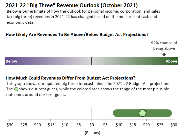 We currently project that there is a good chance that collections from the state’s “big three” taxes—personal income, sales, and corporation taxes—will exceed the budget act assumption of $170 billion in 2021-22 by at least several billion dollars. Currently, our best estimate is that there will be somewhere between $8 billion and $30 billion in unanticipated revenue. As reflected by the width of this range, with so much of the fiscal year ahead of us there remains significant uncertainty about how much the state ultimately will collect. We also caution that the implications of unanticipated revenues for the state's budget are not straightforward. As we discuss here, an additional $1 of unanticipated revenue results in, on average, about $0.40 of additional state surplus.