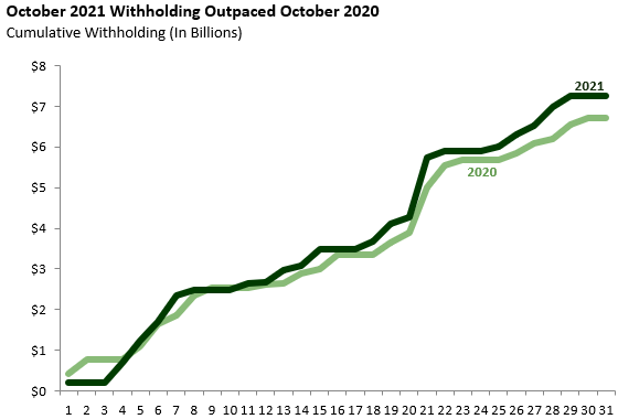 The next graph shows cumulative withholding since the start of the fiscal year compared to the same dates in 2020-21 and 2019-20. Collections through October were up $4.8 billion (20.2 percent) over 2020-21 and $6.5 billion (29.5 percent) over 2019-20.