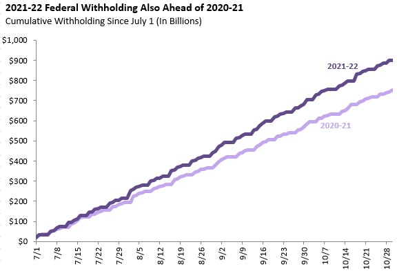 The next graph shows federal income tax withholding since July 1 in 2020-21 and 2021-22. Through October, federal withholding was up 19.5 percent from last year, slightly below the state’s pace.