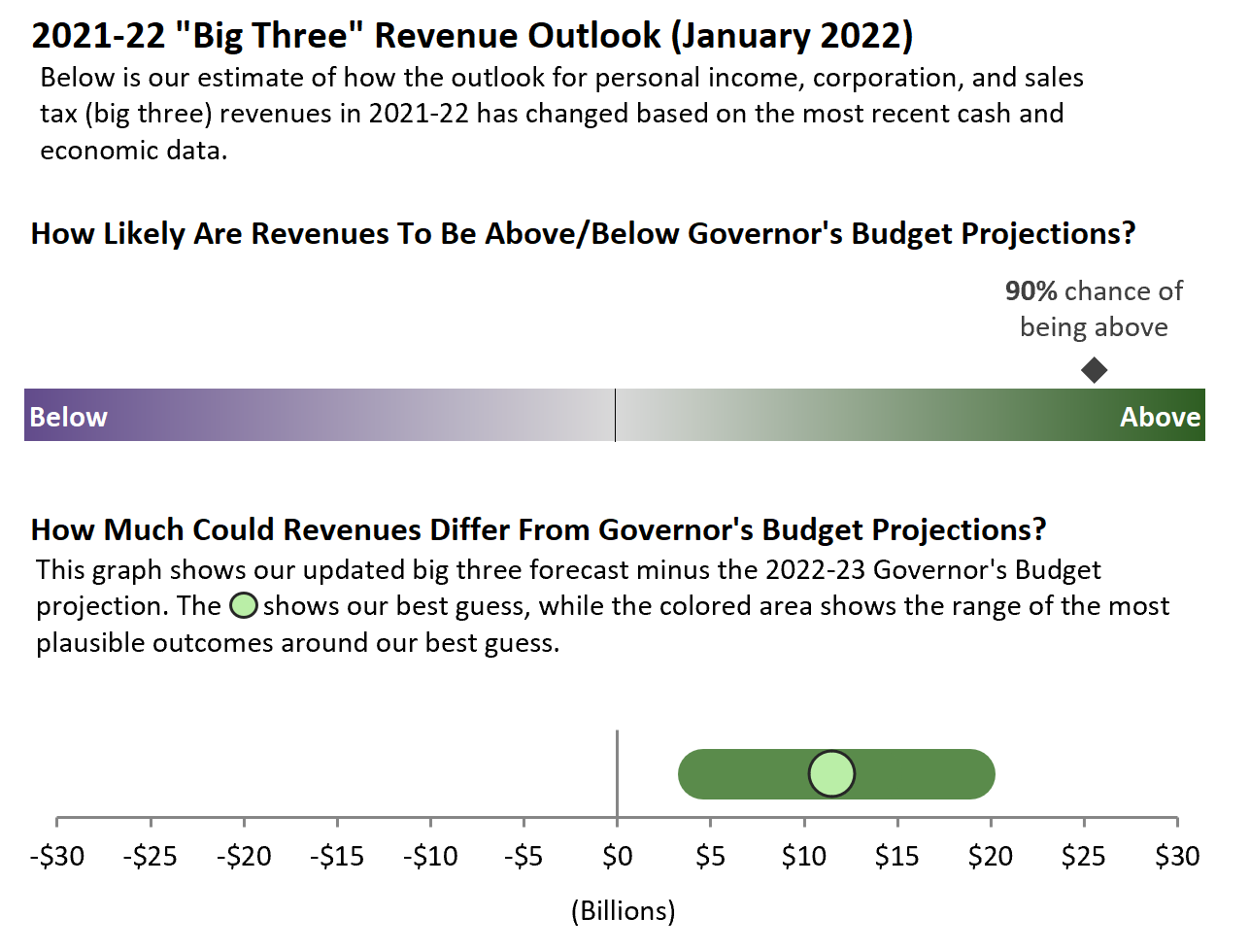 We currently project that there is a strong chance that collections from the state’s “big three” taxes—personal income, sales, and corporation taxes—will exceed the Governor’s Budget assumption of $184.6 billion in 2021-22. Currently, our best estimate is that there will be somewhere between $4 billion and $20 billion in unanticipated revenue. As reflected by the width of this range, with half of the fiscal year ahead of us there remains significant uncertainty about how much the state ultimately will collect. We also caution that the implications of unanticipated revenues for the state's budget are not straightforward. As we discuss here, an additional $1 of unanticipated revenue results in, on average, about $0.40 of additional state surplus. In addition, as we discuss here, additional revenues likely would need to be spent on purposes that meet the State Appropriations Limit's requirements, which reduces the Legislature's flexibility over these funds considerably.
