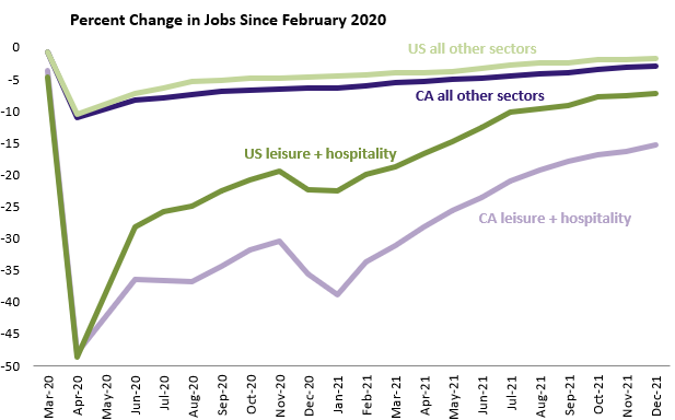 The figure below shows how employment has evolved in both the state and the nation since the start of the pandemic. Overall employment in the state as of the middle of December was 4.4 percent below the level of February 2020, considerably worse than the national figure of 2.3 percent. About a third of this 2.1 percentage point gap is attributable to the leisure and hospitality sector which includes restaurants, bars, and hotels. With the December jobs figures, the leisure/hospitality gap between the state and nation continued to close slowly as it has over the past several months.