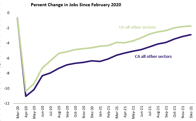 The next graph isolates aggregate employment in the other sectors and shows that the gap between the state and the rest of the nation narrowed slightly in December.