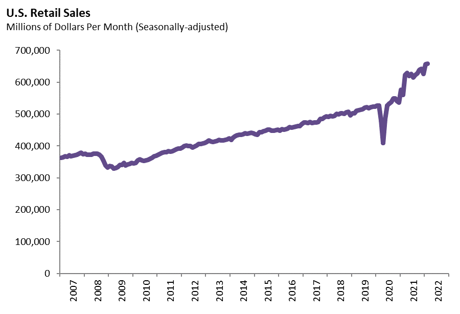 Retail Sales Remain Elevated. Seasonally adjusted U.S. retail sales grew 0.3 percent from January to February. Retail sales have been elevated after growing dramatically in the early months of 2021. Cumulative twelve-month growth in sales from February 2021 to February 2022 was 17.6 percent.