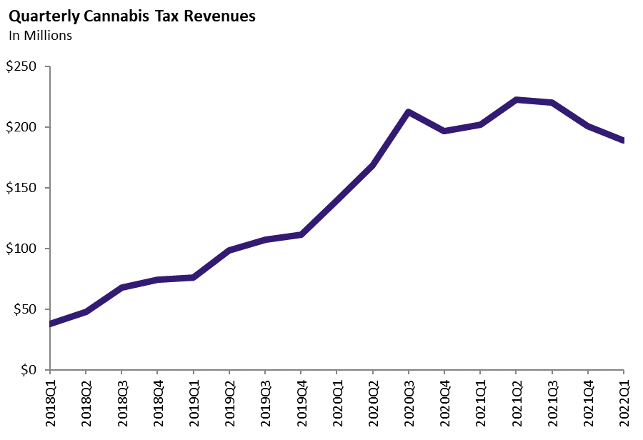 Preliminary Total for Third Quarter of 2021-22: $189 Million. The administration currently estimates that retail excise tax revenue was $156 million and cultivation tax revenue was $33 million in the third quarter of fiscal year 2021-22 (January through March).