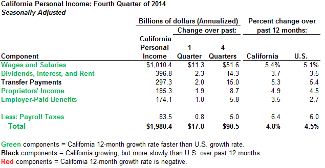 Wages and Salaries Growing Faster in California Than U.S. Over Past Year. As the table above shows, wages and salaries account for just more than half of the state’s personal income. Over the past 12 months, wages and salaries grew somewhat faster than the other components of personal income. They also grew slightly faster in California than in the rest of the nation. Income growth in the fourth quarter of 2014 also appears to have been somewhat slower than it was in the first three quarters. (More information on the various components of personal income is available here.)